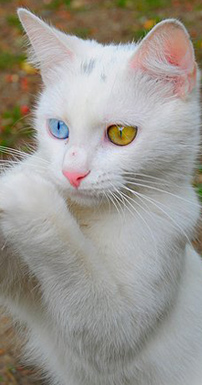 У Золотинки красивая и необычная внешность!)))У кошки белая ,гладкая шерсть, за которой Золотинка тщательно следит и регулярно чистит. Также у нее есть белые ушки, которые все время стоят торчком, так как Золотинка всегда настороже. Нежные и мягкие лапки, пушистый хвостик, вот такая она вся белая и пушистая. Но это только с виду. Кошка хрупкая, но главное ее преимущество-это ловкость. Золотинка очень ловкая и гибкая, поэтому ее внешность обманчива для противника. Также у кошки очаровательные глазки: один голубенький, а другой желтенький.